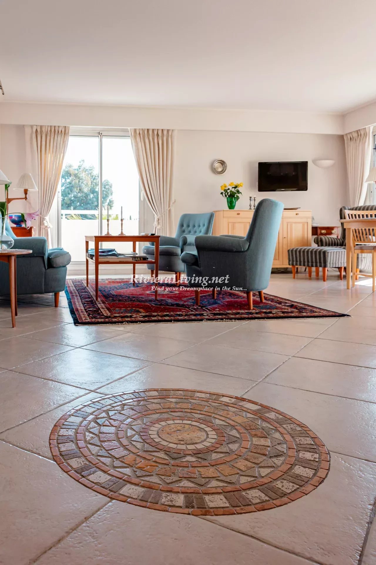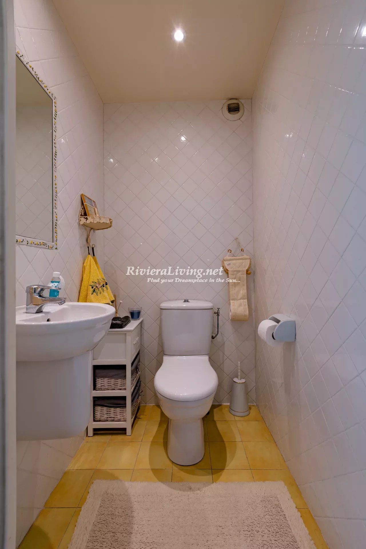 Entréhall med gästwc, masterbedroom med eget badrum och utgång till terrassen, stort ljust vardagsrum - matrum med elegant utrustat barkök. Utgång till den soliga terrassen från vardagsrum och kök. 2 sovrum inord med balkong, ett duschrum med wc.